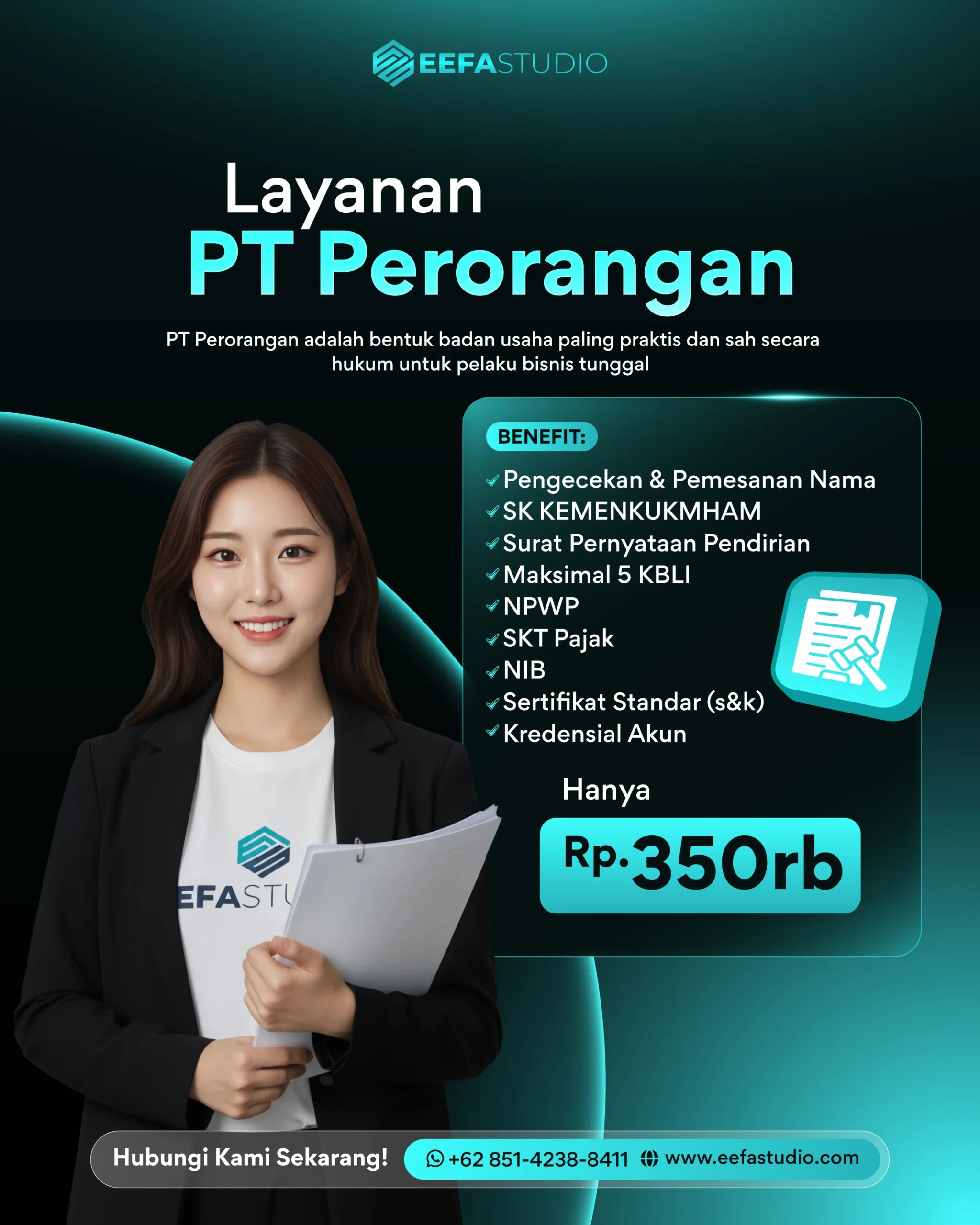 Ingin memiliki legalitas usaha resmi tanpa rumit dan panjang prosesnya? PT Perorangan adalah bentuk badan usaha paling praktis dan sah secara hukum untuk pelaku bisnis tunggal — dan Eefa Studio membantu mengurus seluruh prosesnya secara profesional, cepat, dan elegan.